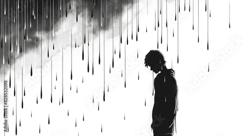 A man is standing in the rain, looking up at the sky. The rain is falling in a continuous stream, creating a sense of sadness and loneliness