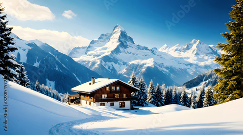 Dwa alpejskie drewniane domy zimą, jasny słoneczny dzień, zasypane śniegiem góry, spokojny krajobraz i turystyczna atmosfera