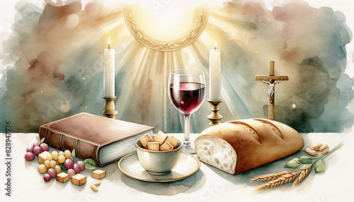 Corpus Christi. Sacred eucharistic symbols chalice of wine and bread. Holy communion still life. Eucharistic symbols. Symbols of the Lord's Supper: Bible, glass of wine and bread on the table