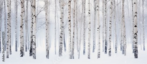 Close up of a birch forest with a wall of trunks creating a textural background for layout ideal as a natural winter landscape with snow and frost perfect for a copy space image