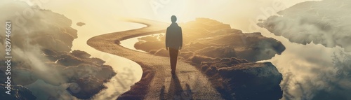 Silhouette of a person walking on a winding path surrounded by clouds, heading towards a bright horizon, symbolizing journey, hope, and adventure.