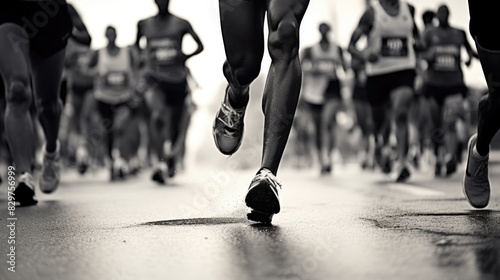 A group of runners are running on a road, with one runner in the foreground and many others behind. Concept of competition and determination as the runners push themselves to reach the finish line
