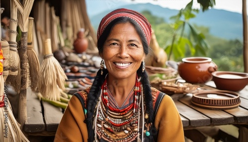 Um retrato de uma mulher indígena sorridente, vestindo roupas tradicionais