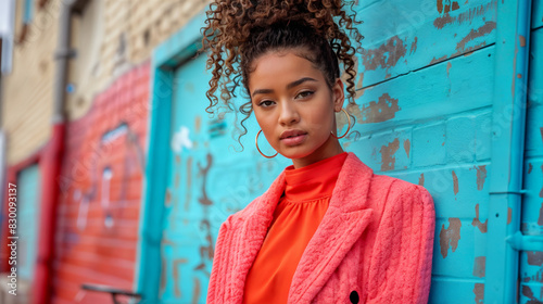 Une influenceuse de mode présente un look tendance appuyée contre un mur bleu