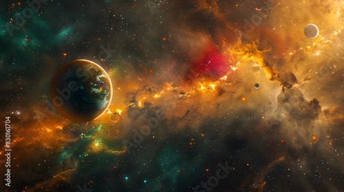 A colorful space scene with three planets and a cloud of purple gas