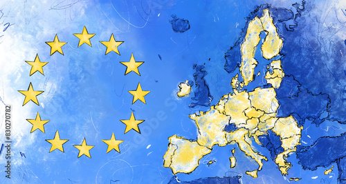 Rysunek z poglądową mapą Unii Europejskiej i flagą