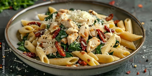 Penne pasta with chicken sundried tomatoes spinach and cheese on a plate. Concept Italian cuisine, Pasta dish, Chicken entree, Sun-dried tomatoes, Fresh spinach, Cheese garnish, Plated presentation