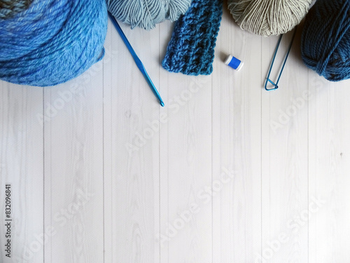 Niebieska wełna i akcesoria do szydełkowania na tle z pionowych białych desek.