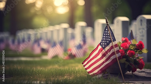 Honoring Sacrifice: Memorial Day Tribute at Arlington Cemetery with Flowers, Flags, and Wreaths, Copy Space for Respect Message