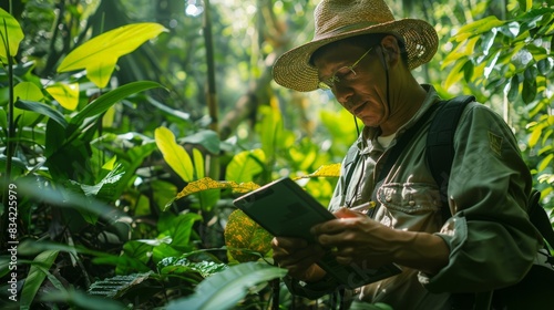 Botanist Researcher Studying Plant Species in Lush Tropical Rainforest Environment - Detailed Image with Natural Atmosphere and Bright Colors