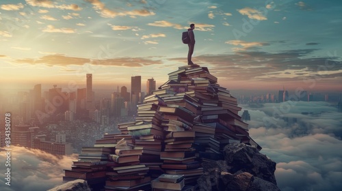 A man gaining knowledge with a view of urban wanderlust, standing tall on a stack of books in the cityscape