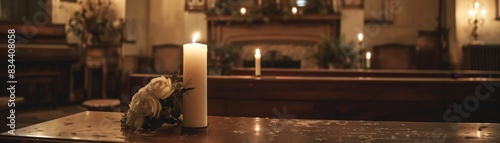 Tranquil Memorial Service in a Nostalgic Funeral Home with Candlelight and Silent Reflection