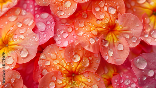 Close-up of lantana flower petals with water drops. top down view, flat lay