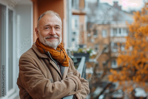 Portrait of a mature male enjoying outdoor city weather, happy man on his apartment terrace with return of fine days.