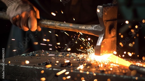 A skilled blacksmith forges metal on an anvil, sparks flying with each precise hammer blow, lighting the workshop.