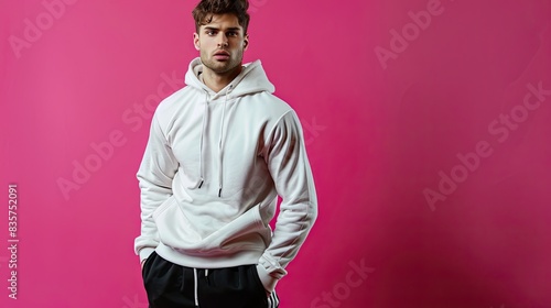 Male fitness model in a fashionable white hoodie with black joggers, isolated on a fuchsia background