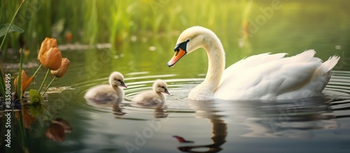 Majestic mute swan interacting with cygnets during golden hour on the serene lake, perfect for a copy space image.