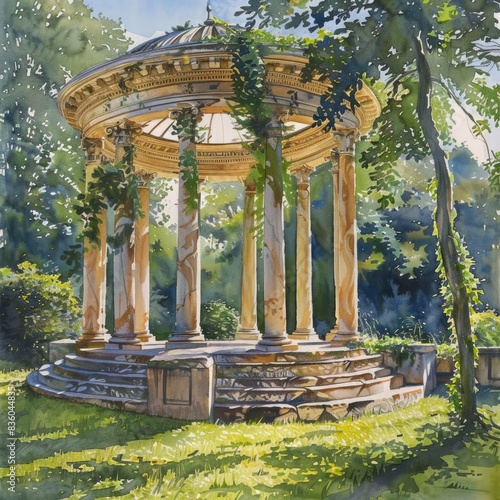 Classic Garden Pavilion. Watercolor Painting of Antique Rotunda in Luxurious Garden Setting