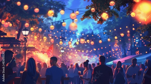 Independent Day Freedom Fest, lively outdoor festival, people enjoying live music, dancing, delicious local cuisine, festive atmosphere, realistic illustration