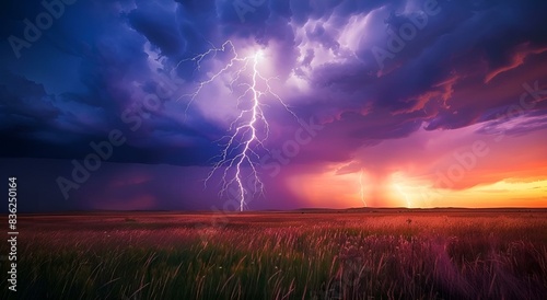 Piorun uderza w otwartym polu podczas burzy – dramatyczne niebo, żywioły i potęga natury w spektakularnym świetle