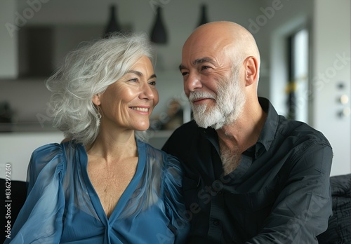 Uśmiechnięta starsza wiekiem para ciesząca się wspólnym czasem w domu