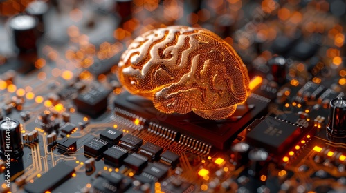 An artificial intelligence, machine learning, deep learning blockchain neural network concept. The brain is made with multiple blockchain processors on a circuit board, 3D rendered with a shining