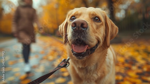 Young woman walking outside with her dog on a leash in autumn - close-up
