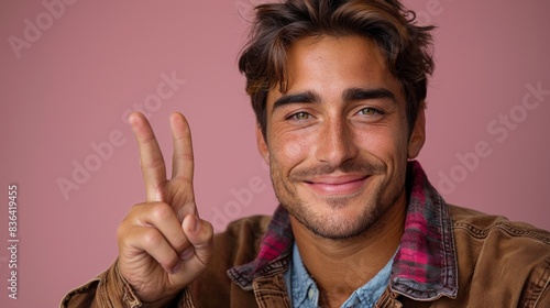 Secondly, view of a young handsome man in casual clothing smiling with a happy face winking at the camera and making the victory sign.