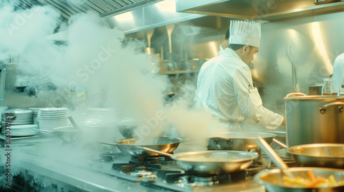 Chef is cooking dishes in commercial kitchen: a lot of steam, hot and humid working conditions