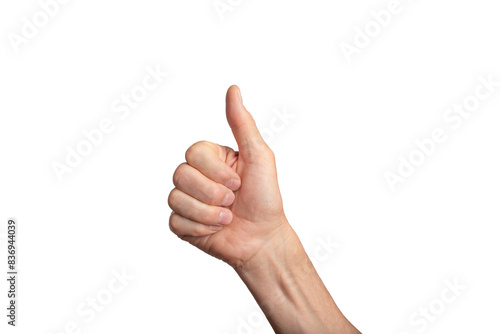 Thumbs up hand isolated male finger. Man arm white, ok good sign. Like background gesture yes showing positive excellent business people. Person symbol success thumbs side, transparent png