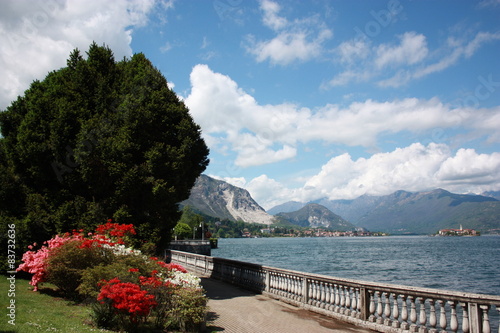 Stresa Waterfront blooming surrounded by Alps under blue sky