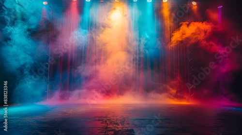 A stage with colorful lights and smoke in the background. The stage had colorful lights and smoke behind it, in the style of various artists.
