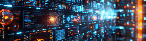 Futuristic digital interface with data visualizations and analytics on a high-tech LED screen, representing modern technology and innovation.