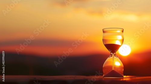 A wooden hourglass with sand in it is set on a beach at sunset. The sand is almost gone, and the hourglass is almost empty. Concept of time passing quickly