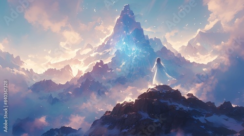 A translucent apparition stands at the highest point of the mountain its ghostly form seeming to merge with the wispy clouds