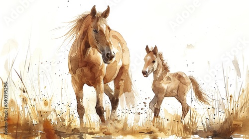 the image shows a sepia watercolor mare and her foal on a white background the illustration is beautifully hand painted.stock photo
