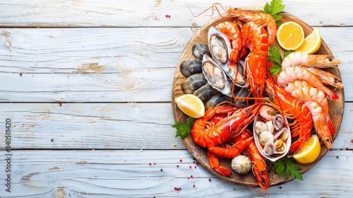 seafood platter with oysters, mussels and salmon on a white wooden background in a top view with copy space for text.