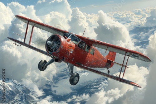 An image of a red vintage biplane flying high above mountainous terrain and clouds
