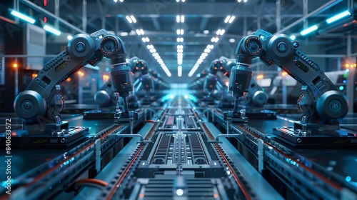 A smart factory floor with robotic arms assembling products, AI monitoring systems