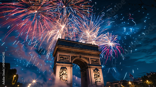 Nighttime view of a city street filled celebrating Bastille Day, illuminated by festive lights and fireworks