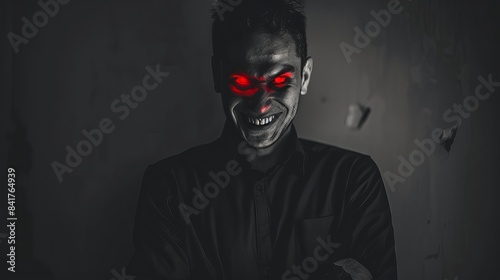 black and white portrait of evil guy who follows lucifers's teachings , his eyes are glowing red and showing evilness