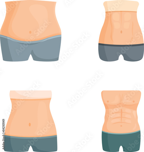 Illustration of the various stages of body transformation from overweight to fit and slim. Abdominal muscles. And physical improvement. With a focus on diet. Exercise. And goal achievement. Wellness