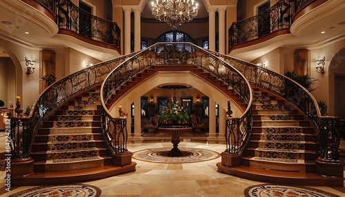 A grand entrance of a luxury home with a dual staircase, each step inlaid with decorative mosaic tiles, under a large, elaborate wrought iron chandelier