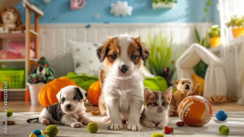 Cute puppy and kitten playing together in a colorful room with toys.