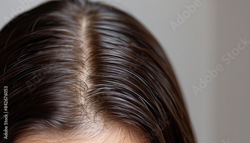 Close-up image of a person's scalp with healthy, shiny brown hair neatly parted in the middle, showcasing good hair care and hygiene.