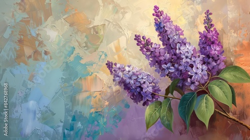 A detailed oil painting of purple lilacs with green leaves