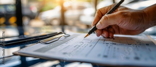 Hand filling out a form with a pen.