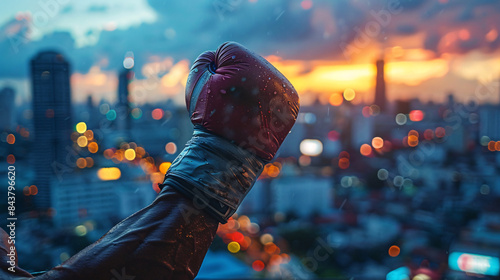 Tradition vs. Modernity in Muay Thai: Close-up of Fighter's Wrapped Fists with Urban Cityscape