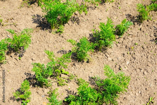 Młoda marchew kiełkuje z ziemi. Ekologiczna marchewka uprawiana w ogrodzie. Zdrowe warzywa rosną na słońcu.