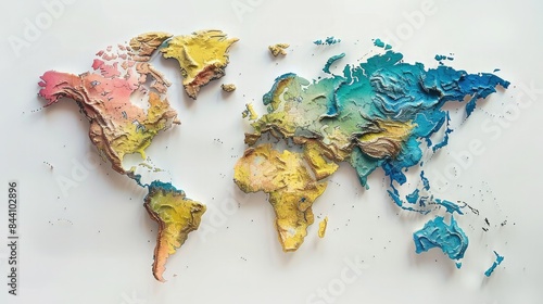 Colorful 3D world map showcasing geographical terrain and elevations, creatively illustrated in vibrant hues, highlighting continents and landscapes.